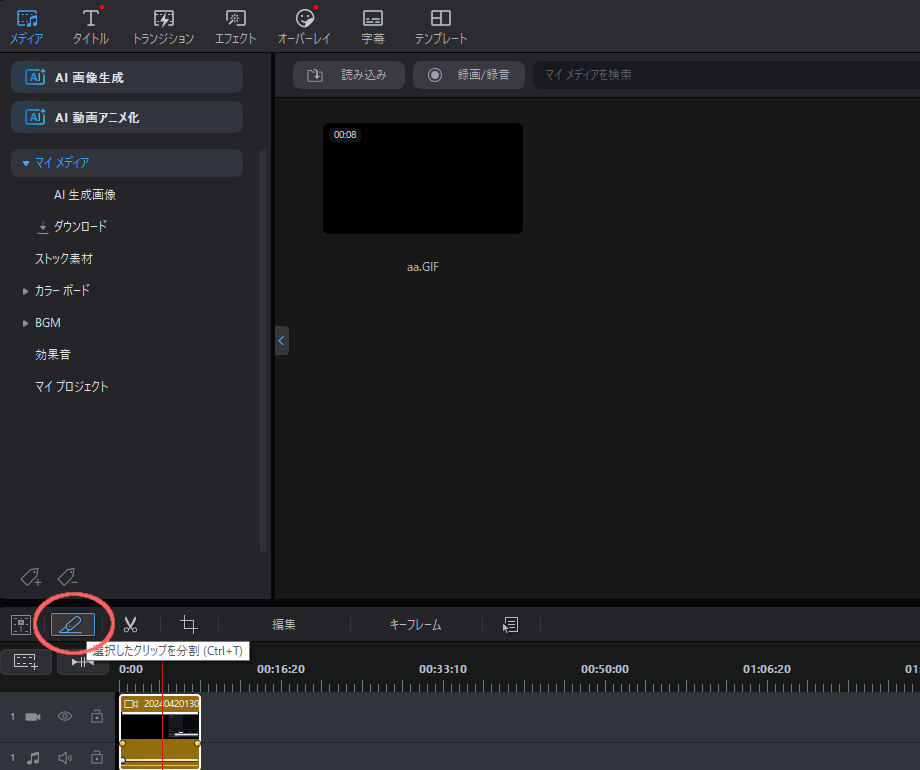 分割したいメディアを何も選択せずに分割すると、タイムラインバーを置いた位置にあるメディアすべてが分割されます。