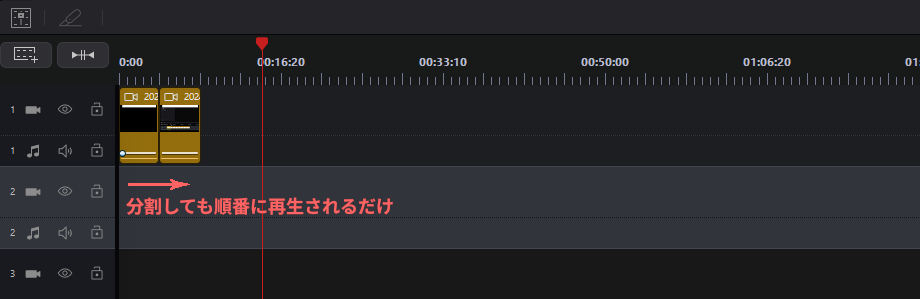 見やすいようにタイムラインバーを脇にずらして、確認してみると動画が分割されているのが分かりますね。
