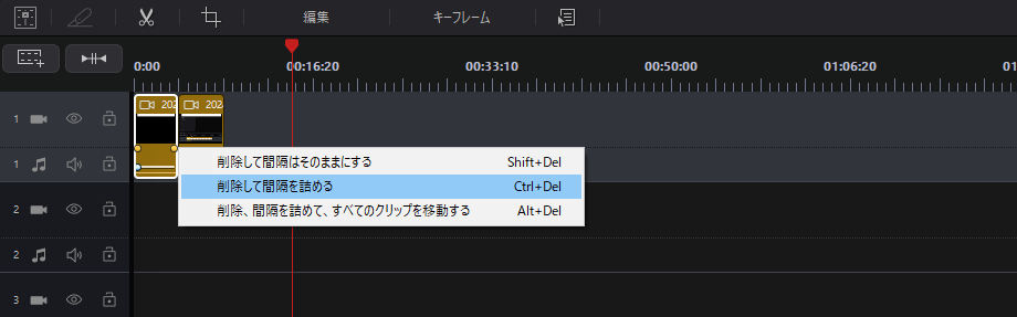 先ほどのように分割しただけでは、書き出しても分割された2つの動画が順番に再生されるだけの動画が書き出されてしまいます。