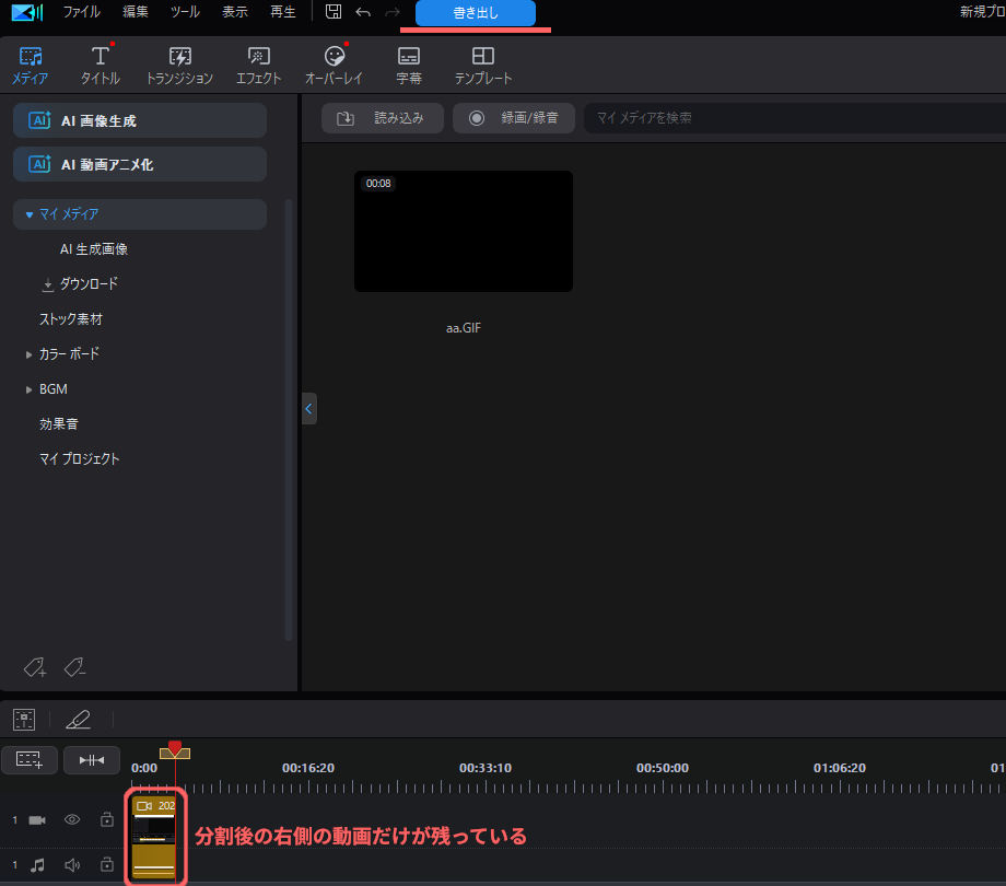 「書き出し」をクリックして、動画を書き出すと無事に2分割後の右側の動画だけを書き出せました。